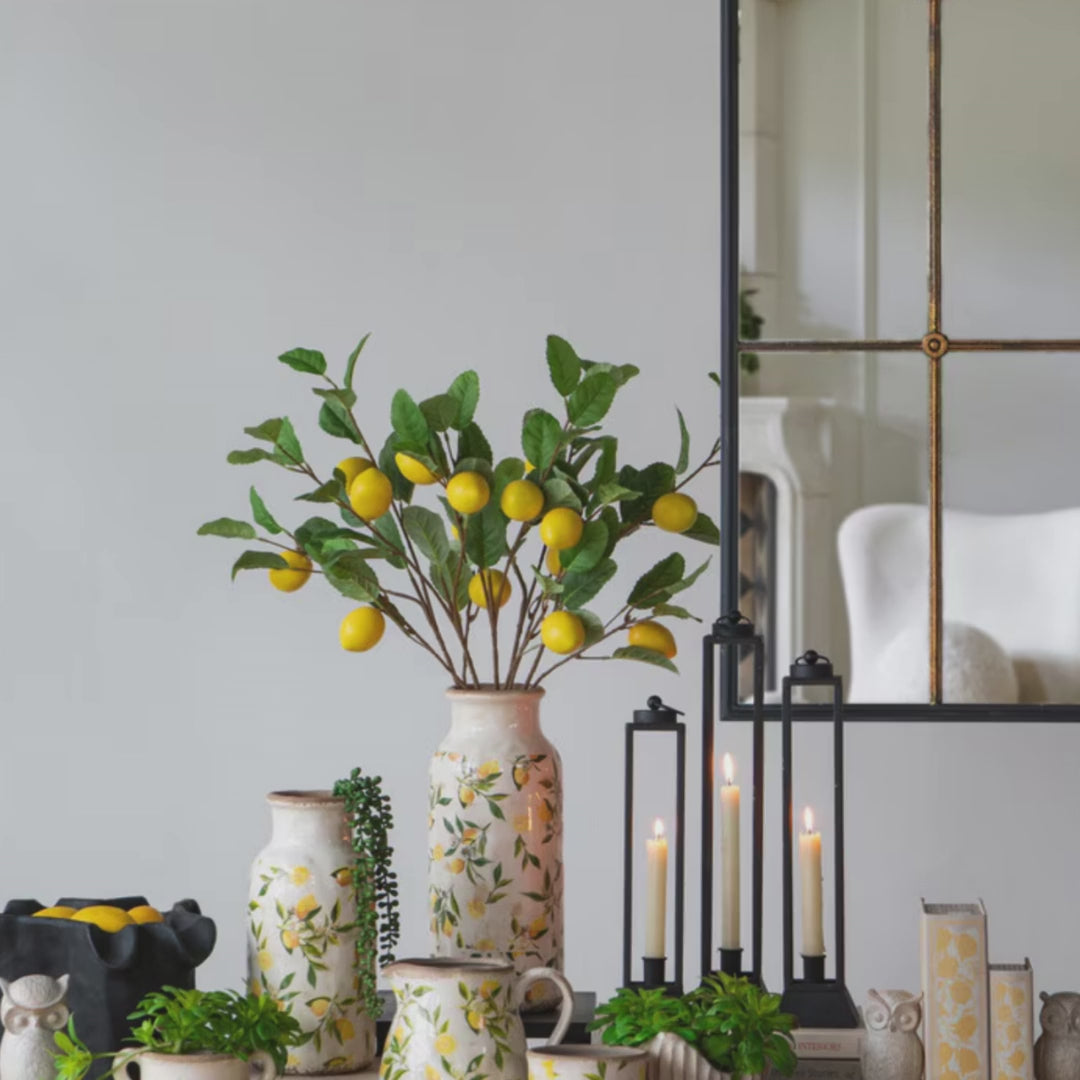 The lemon spray features bright yellow lemons and lush green leaves, adding a fresh, natural touch to any arrangement. Perfect for bringing a pop of color and a vibrant, citrus-inspired look to your decor.