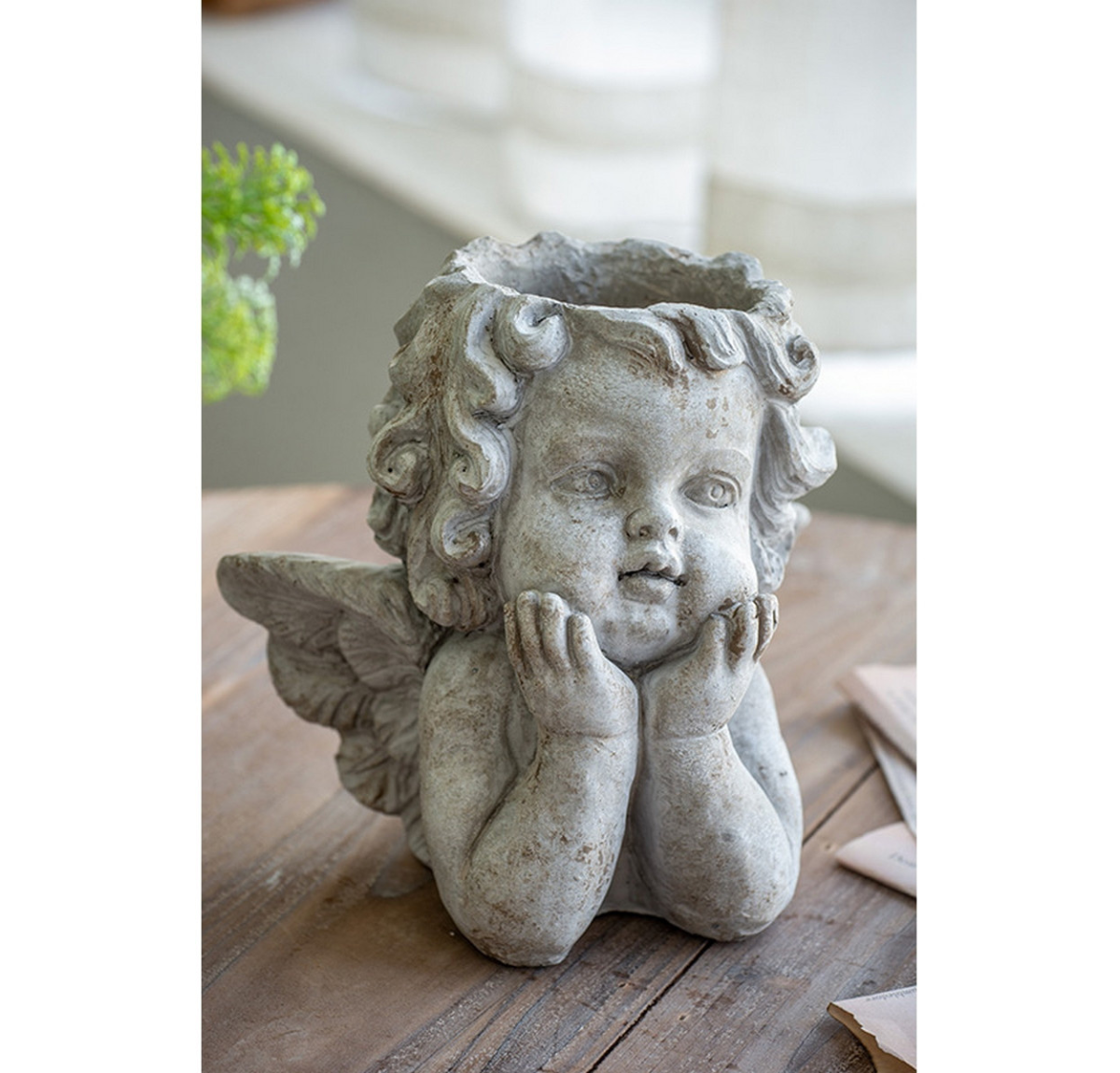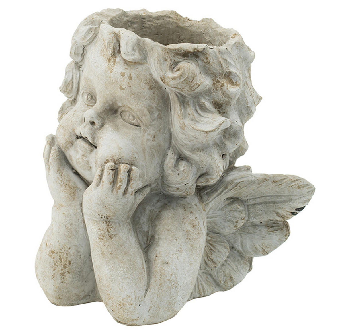 This 200mm small cherub angel planter is a heavenly way to house a favourite planting. This off-white angel features classic, beautifully sculpted wings and curls, and sweetly rounded face. This petite planter will fit perfectly on a tabletop or wide windowsill.